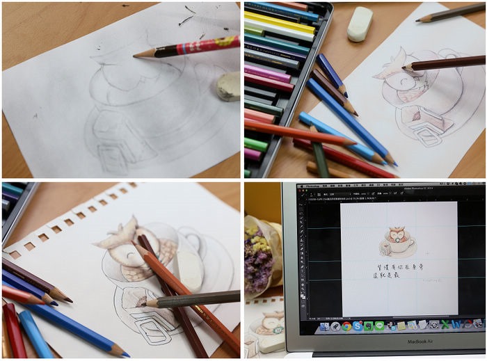 我很愛賴床,每天都會設定3個鬧鐘時間對付貪睡的自己。這次合作在構想草稿與文字的時候,就以「早上能看到這真開心!」為出發點,希望在早晨被早安鬧鐘喚醒的大家,會因為看到我的插畫,更期待一天的開始!