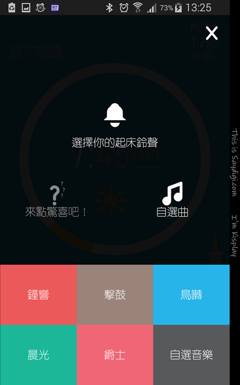 設定完時間後,就可以開始挑選起床鈴聲,你可以自己選擇曲目,若使用 Android 智慧型手機,還可以選擇手機內的音樂檔,也可以讓 APP 隨機選擇鈴聲,讓每個早晨都有不一樣的音樂來喚醒。基本上聽到陌生的音樂都會醒得比較快,所以”來點驚喜吧!”這功能還滿貼心的!