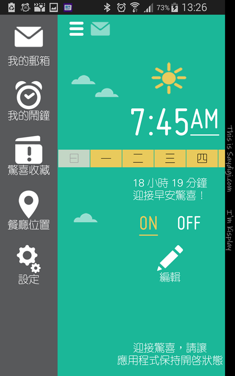 這麼棒的 APP,當然也要推薦給各位朋友們,在每個憂鬱的早晨,你是否還帶著昨晚熬夜的身軀?腫著一副睡不飽的雙眼?這 APP 絕對沒辦法解決你兩眼渙散,但早晨的一個小驚喜、一個小體貼,或許就是開啟你今天幸運的鑰匙!