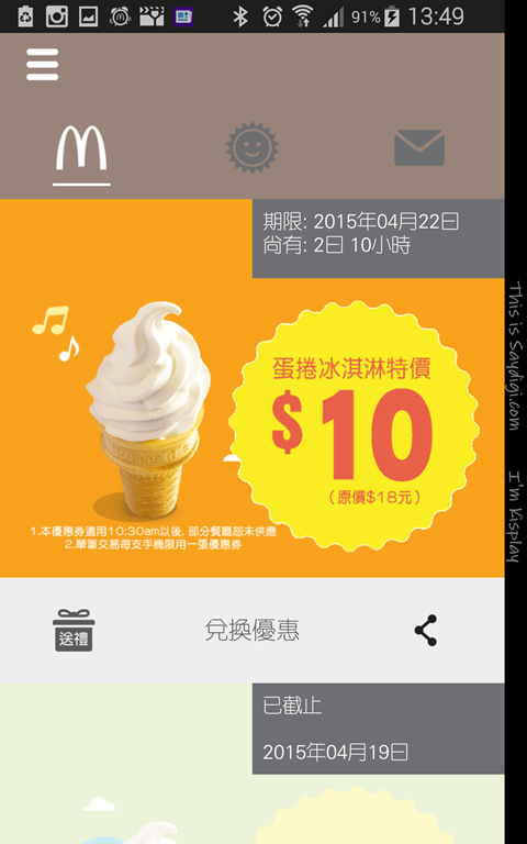 如果你有許多優惠券想要分享給你朋友,也可透過分享鍵來送給有使用麥當勞鬧鐘的朋友,如果他剛好沒有使用,也可以順便邀請他加入這超優惠的 APP。