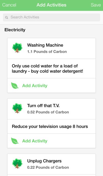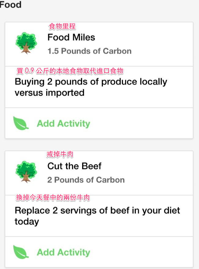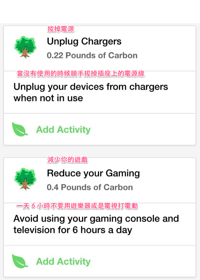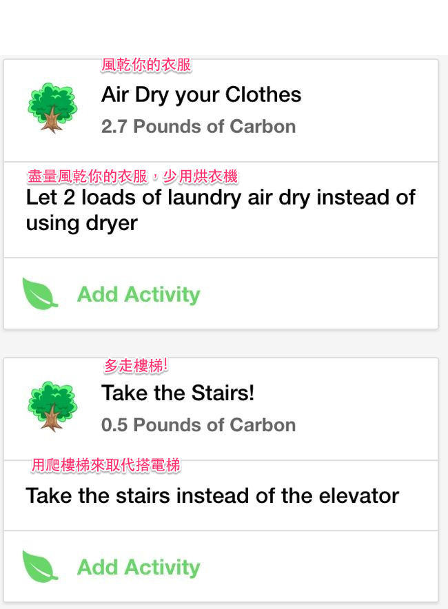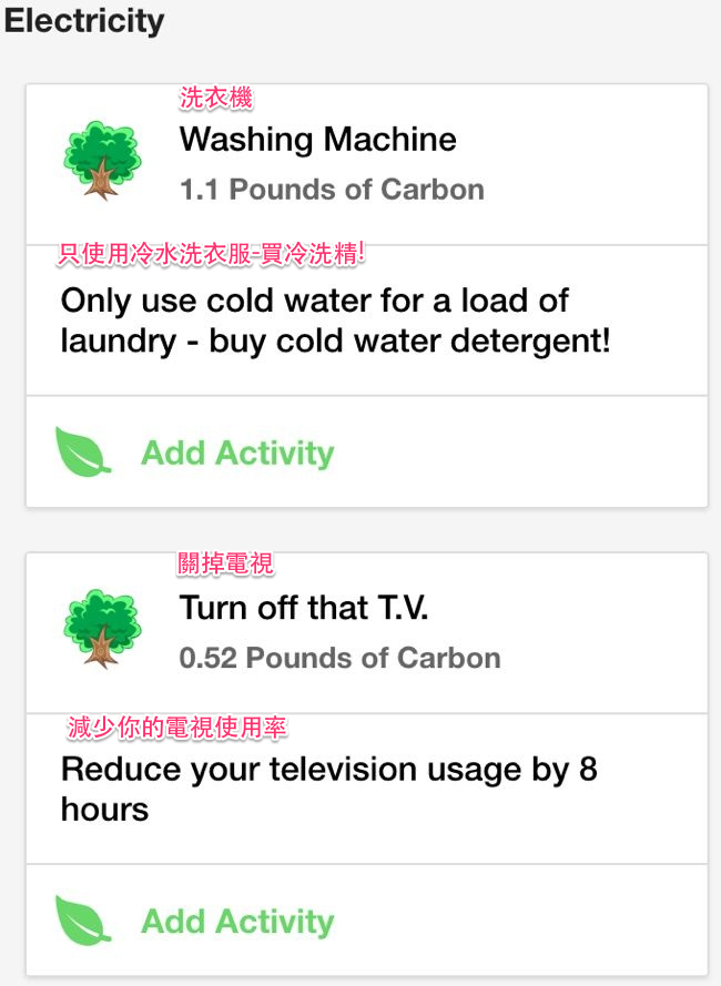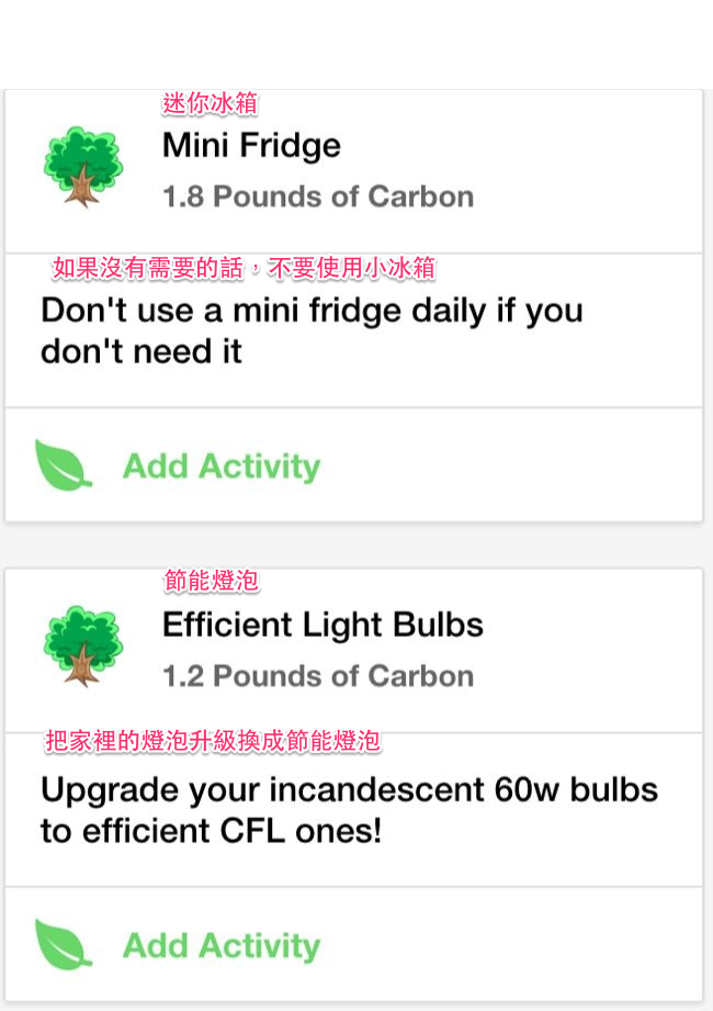 左頁有著進階的功能可以選擇,”Activities” 就是我們剛剛設定的那些節能減碳方法。
