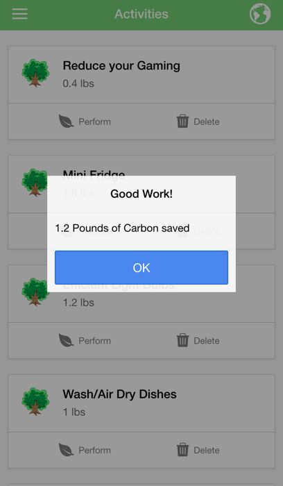 而隨時當我們做到要配合的動作,按下有著葉子的 “Perform”,就算是記錄起來我們這個動作省下了多少碳或水。