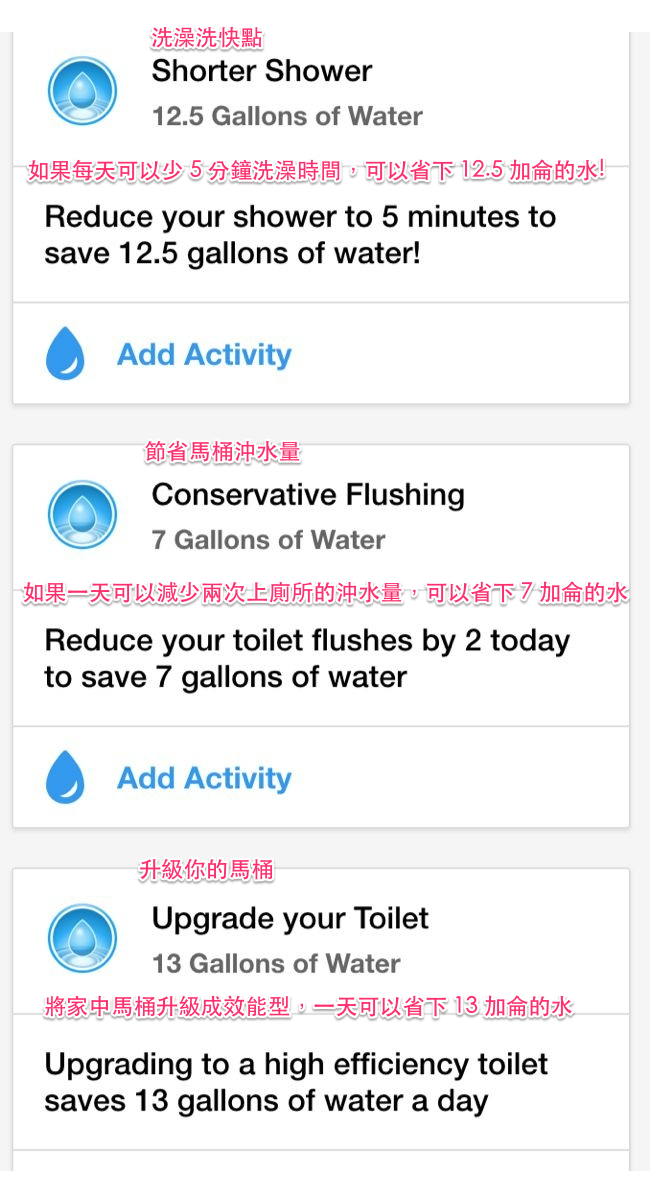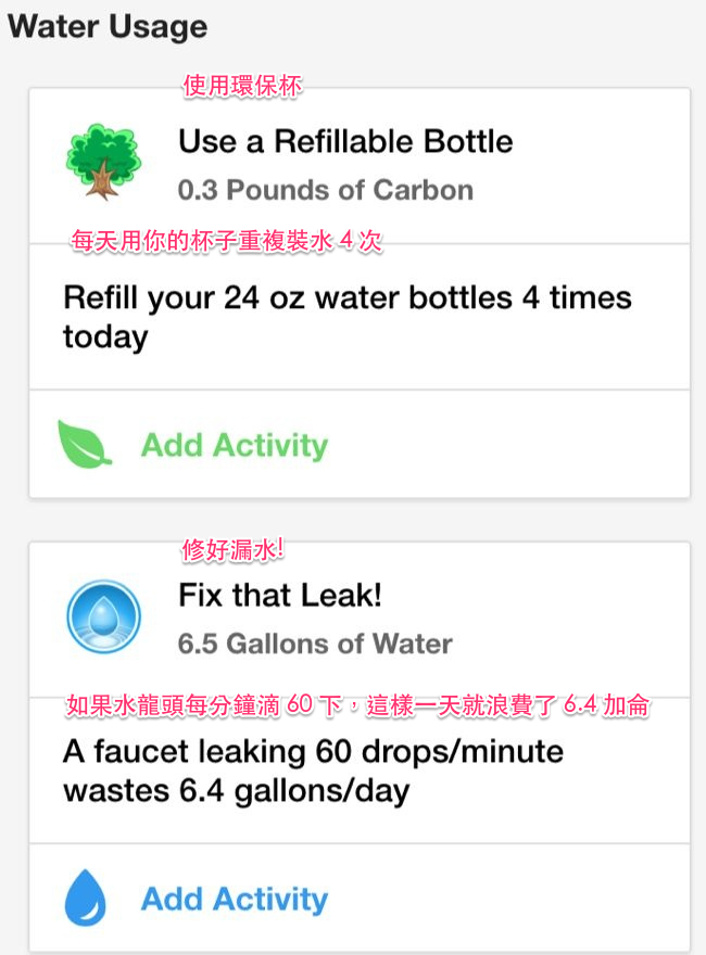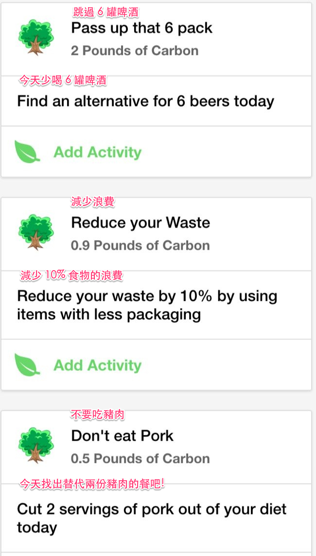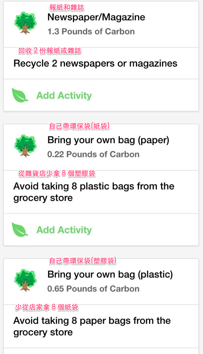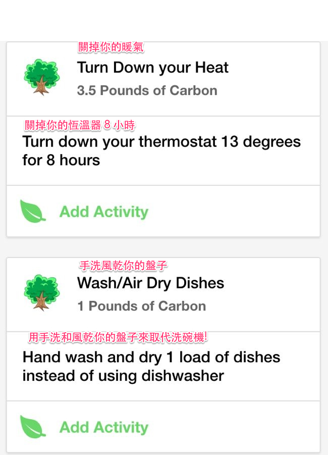 因為這個 app 目前只有支援英文,如果有興趣一起來響應環保的話,這邊也將可以加入的舉手環保內容翻譯成中文提供給大家參考。
