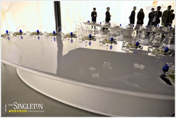 ▼ 結束全感空間的導覽之旅後,接著我們來到了<品酩館>,這是一個全台首創的環景品酩空間>,透過橢圓形白色鏡面長桌及環景投影,除了能 夠以全感環景呈現蘇格蘭壯闊的風光,讓人彷彿置身蘇格登格蘭奧德(Glen Ord)酒廠中外,讓威士忌愛好者更可直接入座並鑑賞蘇格登迷人的酒香!