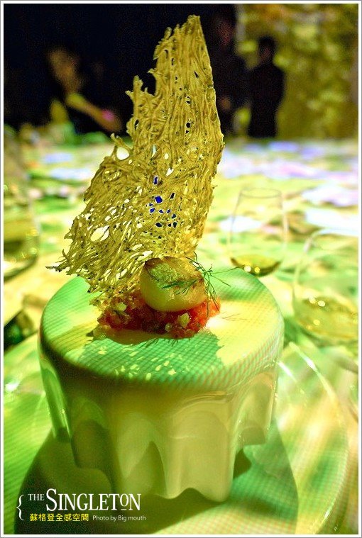 ▼第三道料理則是由世界名廚江振誠特別為蘇格登全感空間所設計的分子料理,在一片如紅色絲綢舞動的全景中完美呈現!這道蜂蜜繽綴野莓冰霜,透過低溫液態氮,採用鳳梨、玫瑰花瓣與各式莓果等下去急速冷凍而成,搭配綿密細緻冰淇淋,口口充滿驚奇感!