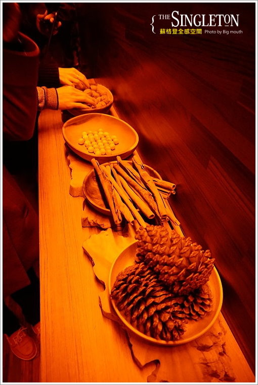 ▼接著來到另一個核果之木的空間,以濃厚秋意為主軸的木質空間,搭配一旁核桃、樟木珠、肉桂、松果等的特殊香氣,<蘇格登大師精選>喝起來有濃郁的堅果、蜜乾果、淡煙燻的特殊香氣,口感厚實醇香!