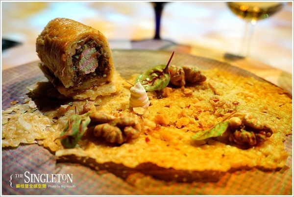 ▼ 緊接上來的第二道料理則是香辣威靈頓豬肉酥皮捲,搭配秋意濃厚、落葉片片的氛圍,不斷落下的楓葉與傾瀉而下的陽光,就灑落在美味的料理上!<蘇格登 大師精選>搭配香辣威靈頓豬肉酥皮捲喝起來有股木質辛香料味,而搭配義大利乾酪片交織起來有股奶油香氣,搭配核桃則是有種堅果香味,每一款舌尖上的 體驗都讓人驚豔!