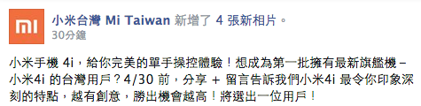 小米手機 4i 預計將有黑、白、粉紅、黃、藍五種顏色,而台灣方面也早就於 3 月底通過 NCC 的審核,因此接下來就只需要等待台灣上市的日期、售價和搶購辦法。小米台灣粉絲頁也緊接著發表會宣布將於 4 月 30 日前讓有興趣的米粉有機會參加活動成為第一個體驗者,如果等不及的朋友也可以去試試看喲!