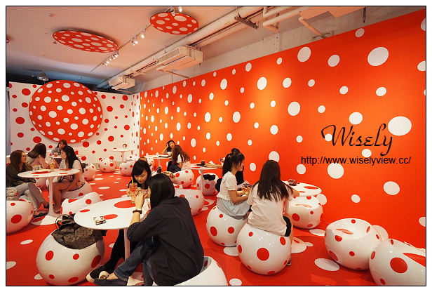 用餐區的空間色系以紅白為主,本身呈現以草間彌生所擅長的鮮豔圓點為呈現。