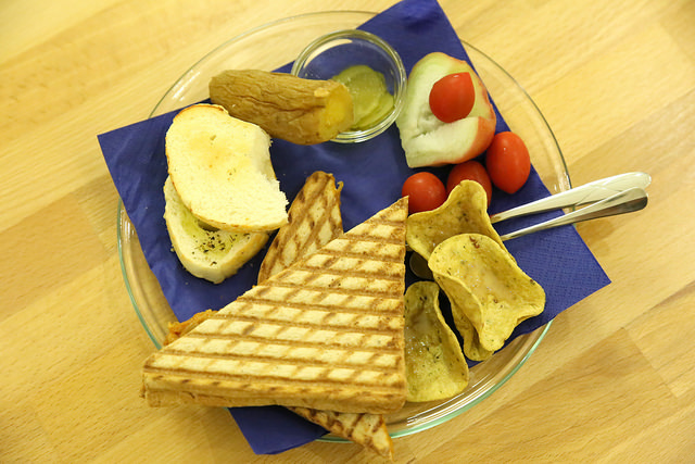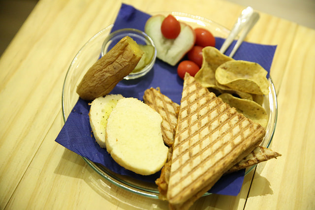 最令人感動的,除了帕尼尼三明治和麵包之外,套餐裡面還附有新鮮水果跟冰心地瓜,以及自家醃製的酸黃瓜。
