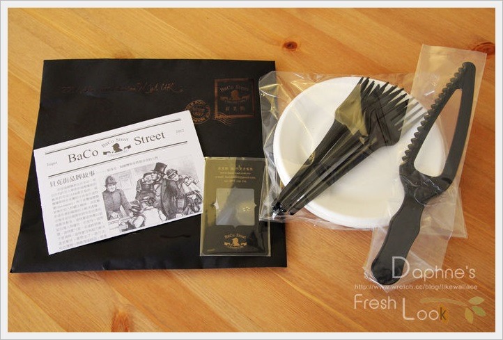 內部的特色燙黑餐具袋裝有紙盤、刀叉及傳說中的”案件委託信”,另外中間的小卡片也不要急於丟棄,是豪華版蛋糕固定會贈送的放大鏡店卡,以呼應福爾摩斯的品牌故事,呼應掘蛋糕美味的真相,而它真的具有放大鏡的功能。