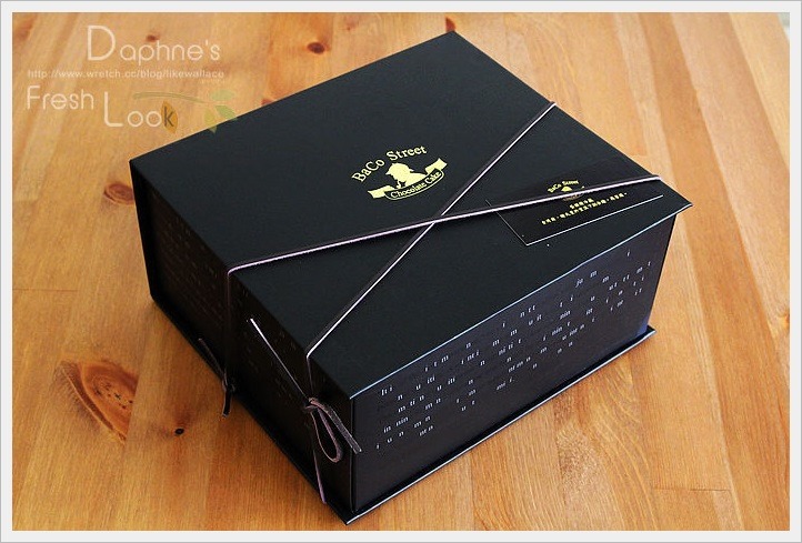 貝克街 BaCo Street 謎-巧克力蛋糕包裝內外都有話題,這次收到的品項是銀色馬 Luxury ,包裝配合巧克力全黑色系,精裝蛋糕紙盒硬而堅固,燙金 Logo 打印在外盒,盒上是店家設計的文字密碼,據說目前無人能破解。