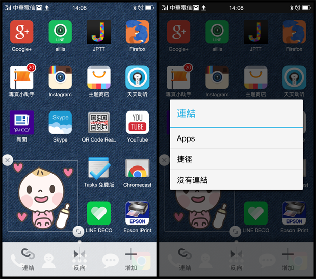 因為恰爾斯自己為了小恰咪,有裝了個 for 小寶寶的 App,平常嫌那個 App 的圖示太小家子氣,這裡就直接換一個小嬰兒的貼紙,直接把連結導向該 App。