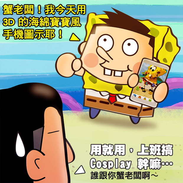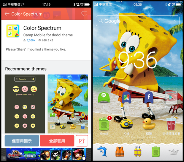 當然除了主題外,裡面的靈魂「圖示」和「桌布」都可以分別換唷!當下你可以選擇套用圖示或整個主題直接套用,像我下載這個海綿寶寶的主題就很有趣,連圖示都是 3D 的,好厲害!