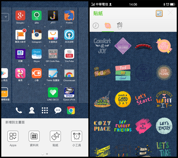 恰爾斯自己很喜歡「自製貼紙」這招,因為很喜歡點擊的 icon 又大又漂亮,自訂手機功能中,我們可以在桌面中任何區塊加上各種照片或貼紙,讓這個貼紙變成一個「按鈕」,這能直接連結到任何一個 App 或最常逛的網站。
