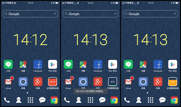 Dodol launcher 桌面 APP 有個小工具我還滿喜歡的,那就是這個「記憶體釋放器」,厲害的是能夠隨時幫我釋放手機的記憶體,讓系統一直可以處於一個高效能的狀態。聰明的是 Dodol 設計了一個 icon,可以清楚的看到目前記憶體的載入情況,像我原本的記憶體大概 84% 滿載,簡單按一下「記憶體釋放器」,就幫我釋放多餘的記憶體,進而提高效能。