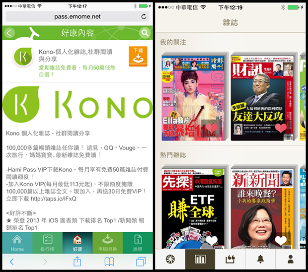 我自己是每天都在期待線上書城的更新,比較常用的就是小寶寶在 iPad 上用的「FunPark 幼幼版」,每個月能免費閱讀 30 本優質童書,每個月還有更新。另外爸爸自己看的「Kono 書城」服務,咱們 Hami Pass 的 VIP 客戶提供 50 篇可以看(一般客戶只有 20 篇),省了不少雜誌的錢。