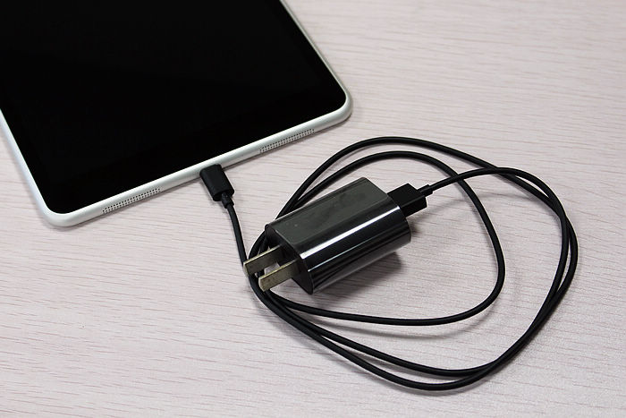附有 USB 電源供應器,一條 USB Type-C 的線,纖薄不具方向性,不管朝上或下都可插入。