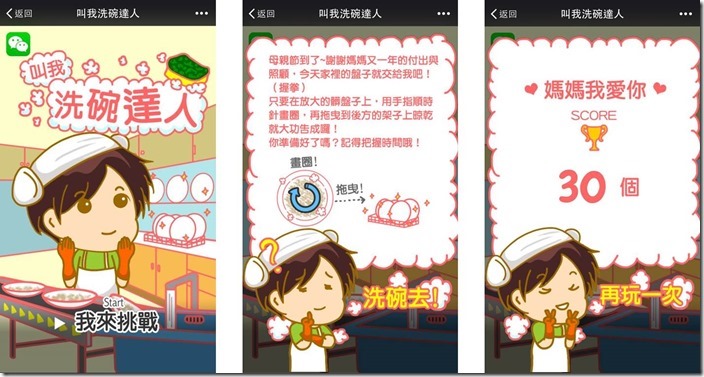 一年一度的母親節即將要到來,WeChat特別為偉大的媽媽們限定推出「洗碗達人」趣味小遊戲,讓大家體會平時家務的辛勞!於5月7日晚間6點起,「洗碗達人」將在WeChat Team登場,於WeChat Team 官方帳號(WeChat ID: WeChat)中點擊「Chat好康」並選擇「洗碗達人」即可進入遊戲。只要在髒盤子上,用手指順時針畫圈清除髒汙,再拖曳至架子上晾乾,就大功告成囉!快動起你的手指幫媽媽分憂解勞,也跟WeChat好友們來場洗碗大比拼,看誰洗的碗最多、最乾淨!