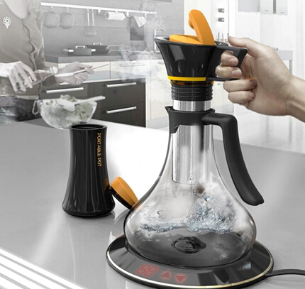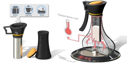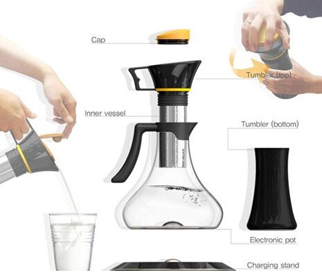 這個電熱壺名為Pertable Pot,目前還是概念產品,一組包括插電的加熱爐台、電熱壺、可獨立加熱的瓶身,也是飲用瓶。它是運用雙沸騰技術,把飲用瓶自黑色的外瓶身抽出,置於電熱壺加熱,壺內沸騰的水會將電熱壺加熱,加熱後取出放進黑色瓶身就可飲用。