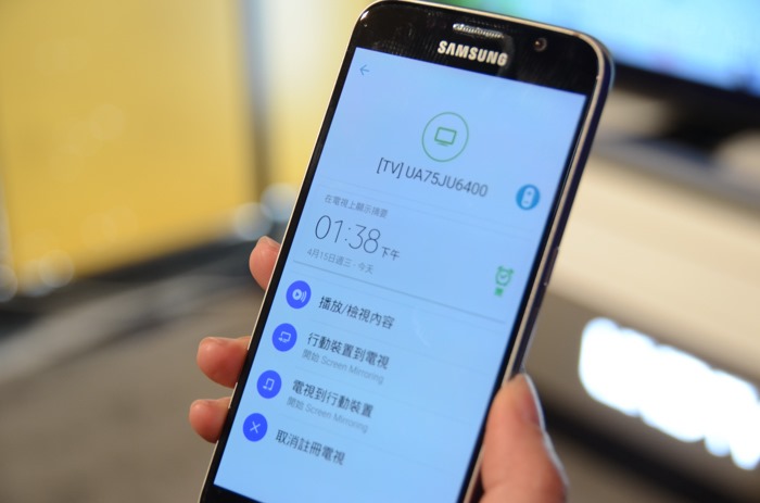 在與手機的連結部分,可透過快速連結(Quick Connect)功能,只要簡單的步驟就可將具有 Quick Connect 功能的三星智慧型手機內容與電視做串接,也可將電視畫面傳至手機上收看。目前支援快速連結(Quick Connect)的三星手機有S6 與 S6 edge,其餘的三星手機也會陸續透過韌體更新以支援這個功能。另外還有個電視秘書的功能,只要設定好早晨的鬧鐘,在鬧鐘響起後,就可以開啟電視,並在電視上秀出時間、天氣與行程,是非常實用的功能。