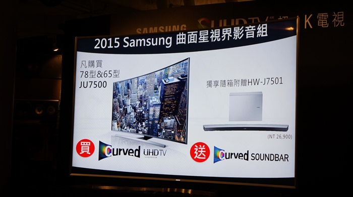 最後分享一下優惠訊息,現在只要購買 78 型與 65 型 JU7500 黃金曲面UHD TV,隨箱附贈 HW-J7501 Curved SOUNDBAR。如果大家想要實際體驗 Samsung SUHD TV 的魅力,也可在 4/25 ~ 4/26 台南小西門店、5/2 ~ 5/3 台中中港店與 5/16 ~ 5/17 台北信義店香堤廣場,都可親眼看到實機,大家不妨也到現場一起體驗看看。