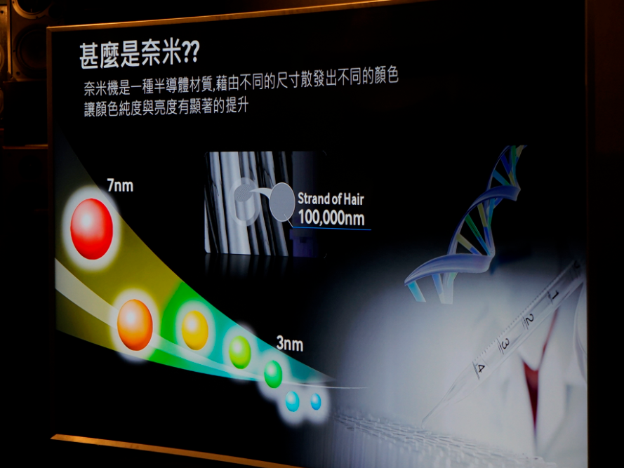 Samsung在他們年度旗艦電視上,最重要的關鍵就是在奈米晶鑽顯像技術,這技術 Kisplay 在之前文章已經有非常詳細的說明介紹。簡單說,就是利用藍光經由佈滿不同粒徑的奈米點,激發出綠光與紅光,讓光譜更廣,對於彩色濾光片的穿透率也更好,自然就可以讓顏色更為飽和,也可更加省電。
