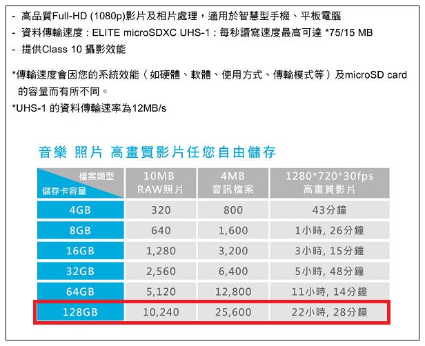 SP廣穎電通ELITE microSDXC UHS-1:128GB 每秒讀最高可達75MB/s讀取、最高15MB/s寫入的傳輸速度,不單是HTC RE也很適合高階型智慧手機,像Wisely使用的平板筆電『ASUS Transformer Book T300Chi』也很適合擴充使用。