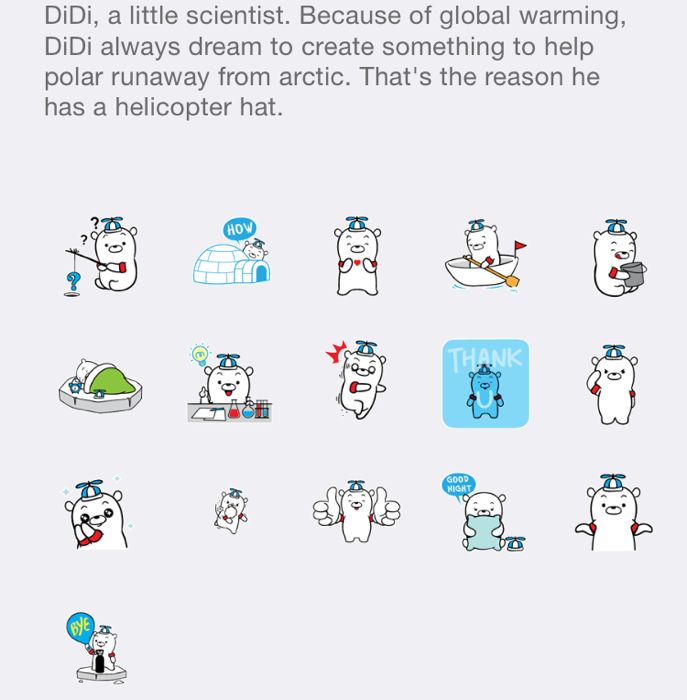 原來這隻超可愛的北極熊是隻一直生長在北極的北極熊 DiDi,可是因為溫室效應的關係讓他的家漸漸地消失,於是他每天絞盡腦汁、想發明可以帶他離開北極的工具,因此他也隨身帶著小小螺旋槳帽子以備不時之需。除了每天必要的「吃東西」和「睡覺」外,DiDi 也在實驗室不停地「研究」,雖然有時會覺得「好累」或是「生氣」,但 DiDi 從未放棄過發明新東西的夢想,這樣努力不懈的 Didi 是不是讓人覺得心疼又可愛呢?! 有用 WeChat 的朋友從現在起也可以快去 WeChat 貼圖市集下載,一起向 DiDi 的精神看齊吧!