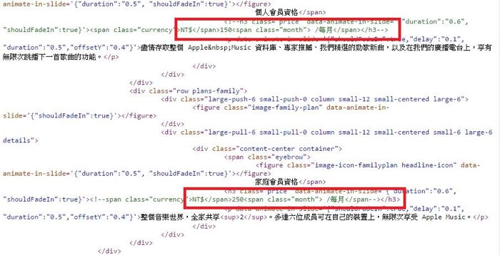 原在發表會中表示將推出分別為個人每個月 USD9.99 (約 NT$310) 與家庭分享餐(?!) 每個月 USD14.99 (約 NT$466) 兩種價格的 Apple Music,意外地從內部的 source code 看出屆時台灣上市時將調降為個人每個月 NT$150 與家庭分享餐 NT$250!