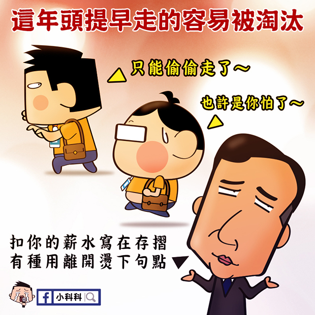 每到快下班時,真的很希望老闆或主管趕快先走,這樣我們才能安心的下班,不然就要想辦法偷偷地走了。不知道為什麼我就會想到淘汰這首歌。