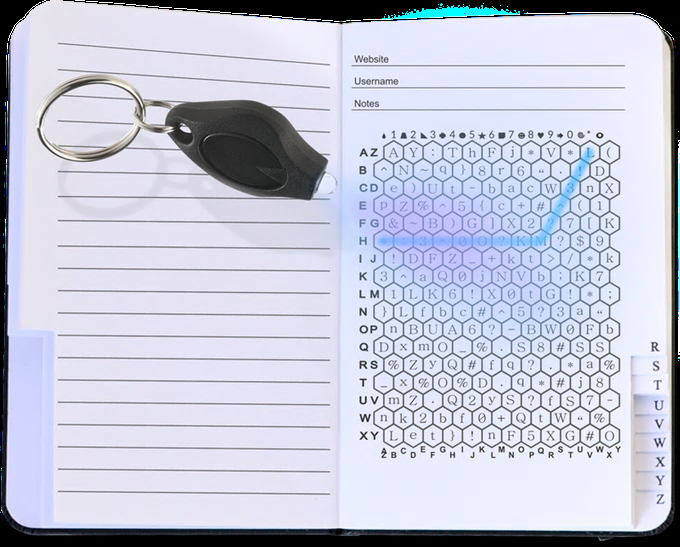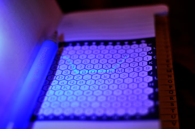 攤開筆計本,內有似蜂巢的整面圖樣,先使用隱形墨水筆在筆記本上隨機劃記密碼記錄,在需要密碼時使用紫外線燈照射就能顯現出來,將所需使用的密碼逐一標示並記錄成冊,如果不使用紫外線燈照射,它與一般筆記本一樣,只會顯示一般的白底黑字。若筆記本寫滿後,能擦拭掉重覆使用。