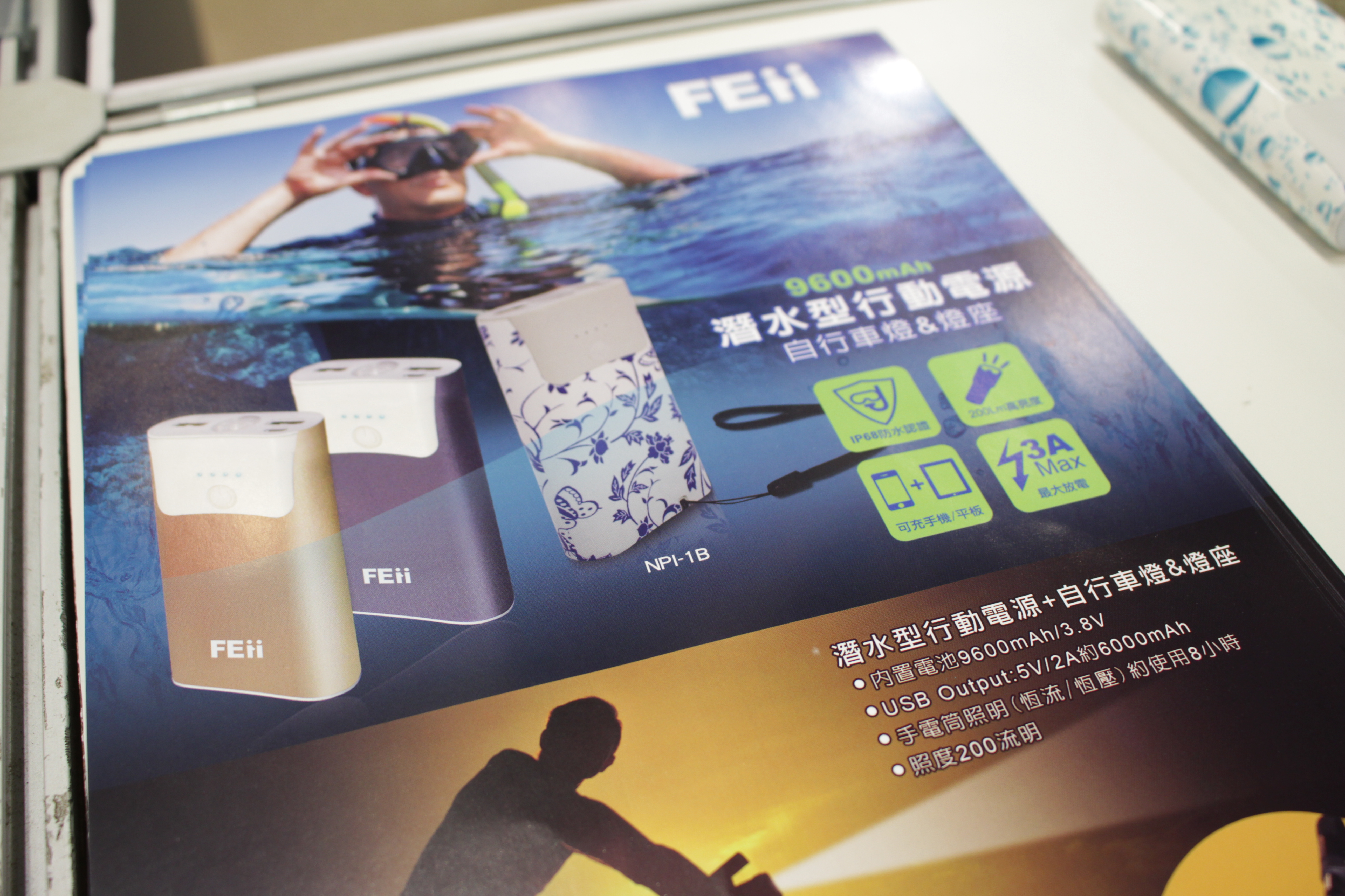 行動電源滿街都是,人手一個已是基本配備,但是要怎樣讓消費者覺得耳目一新呢?Feii 推出一款防水並結合電筒照明的潛水型行動電源,讓使用者即便在水中或是在夜晚行進中,也能達到醒目安全的效果。