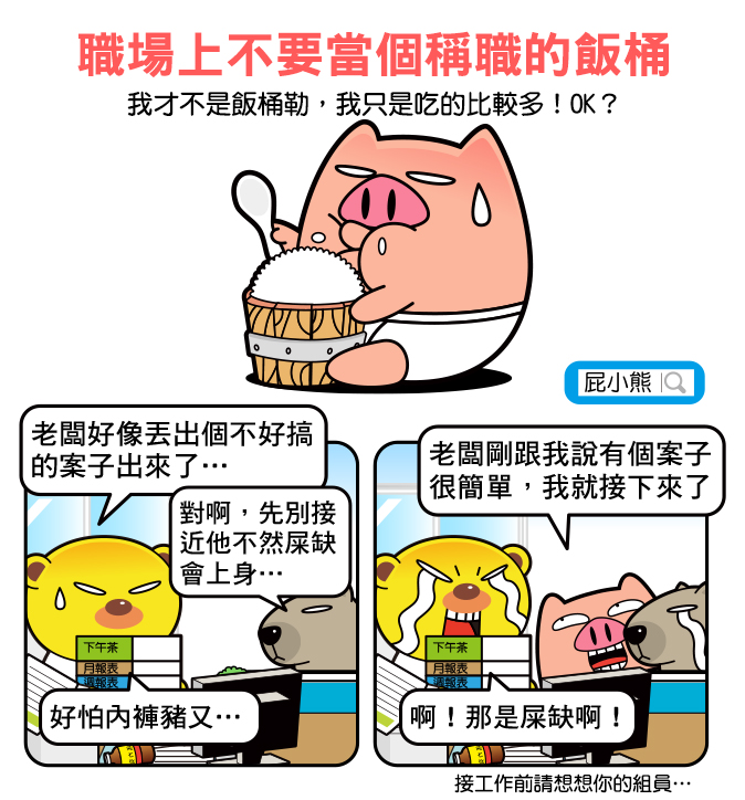 屁小熊 2015/06/11瀏覽: views 不是屎缺不來找你,而是常會有人幫你接屎缺回來啊~~~ 在公司工作,很常是團隊或是分組的工作內容,但請在接工作前,也好好評估至下整個團體的執行力或是手邊的工作啊~~~~有時為了搶功常接一些屎缺回來可是會害慘整個團隊的~~共勉之~~~ Related Items屁熊內褲豬屎缺職場搞笑漫畫飯桶 圖文觀點 2015/06/11瀏覽: views 屁小熊 愛分享上班搞笑的屁熊還有內褲豬,職場不開心的話就快來找我們 ■作者:屁小熊 ■主題:職場、漫畫、生活、搞笑 ■個人網站:https://padbear68ee07.blogspot.com/ ■FB粉絲團:https://www.facebook.com/ppbear123 ■連絡方式:197968ee07@gmail.com Related Items屁熊內褲豬屎缺職場搞笑漫畫飯桶 next page