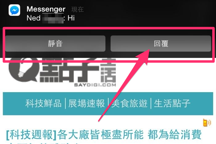 而經過測試,除了訊息可以直接透過通知列來進行回覆以外,Facebook Messenger 則是有兩個 “靜音” 與 “回覆” 選項提供,若是選擇 “回覆” 便會切換到 Facebook Messenger 應用程式中來做回覆的動作。