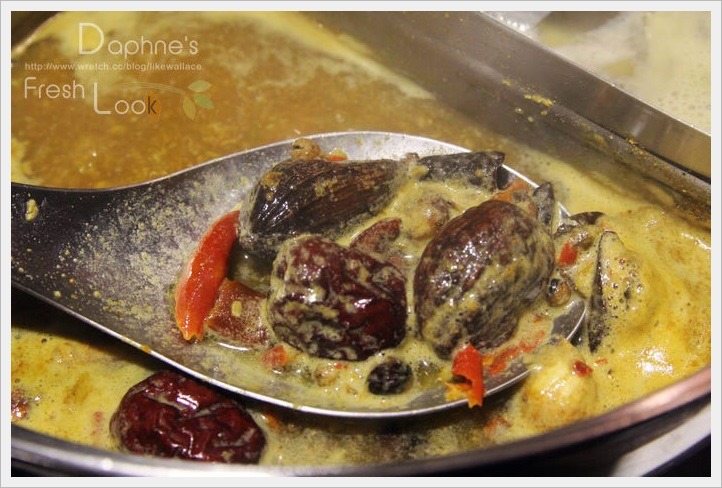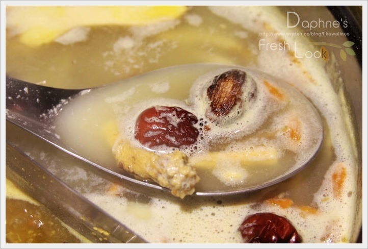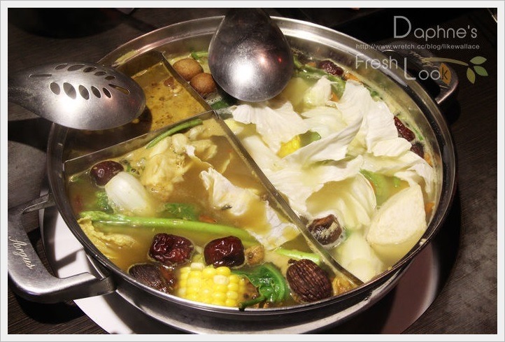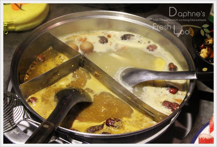 白鍋:以龍眼、枸杞、紅棗、黨參熬成,湯頭柔滑順口,有淡淡的中藥甘香,隨著煮過的蔬菜出汁漸有甜味出來。店家建議先煮菜、再煮海鮮或王子麵,讓湯頭不會一開始就走味。