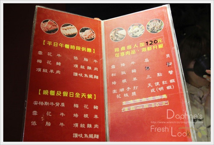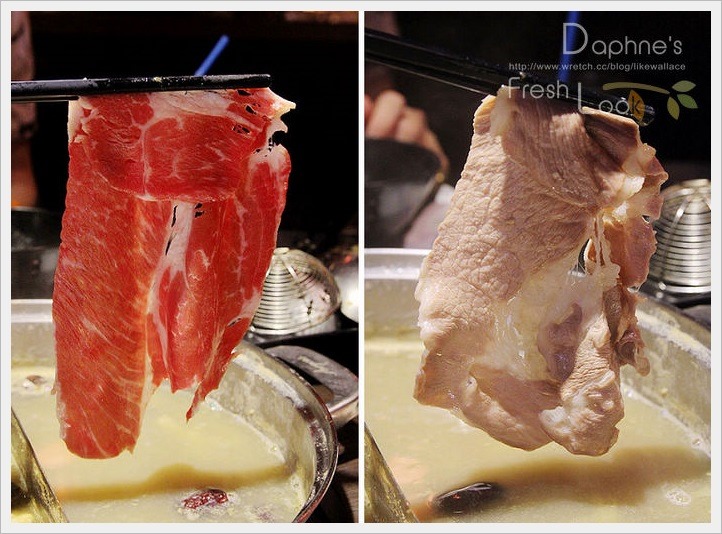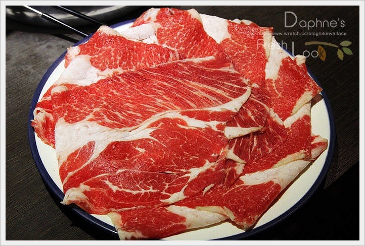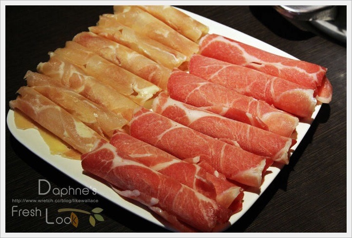 肉類我們只點左邊的頂級雞肉、右邊的梅花豬,及下一張的安格斯牛背肩,全是現點現切,再加上自助區的食材夾一些就吃的很飽,所以建議除同行的人多,第一輪的肉類請點的保守一點,不夠再加點才不會浪費。