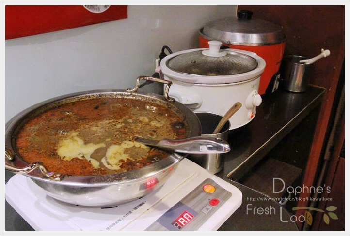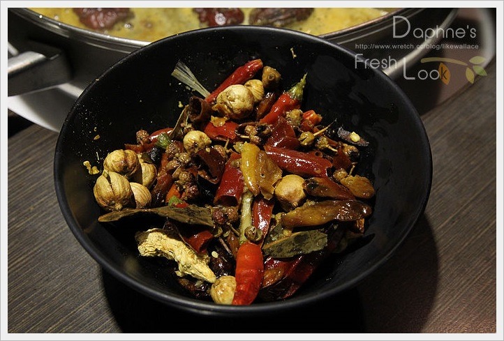 在正式下料至鍋前,標準程序是把鍋內的紅辣椒撈起,有需要增加辣度再添加回去,辣椒是店家自己炒的。
