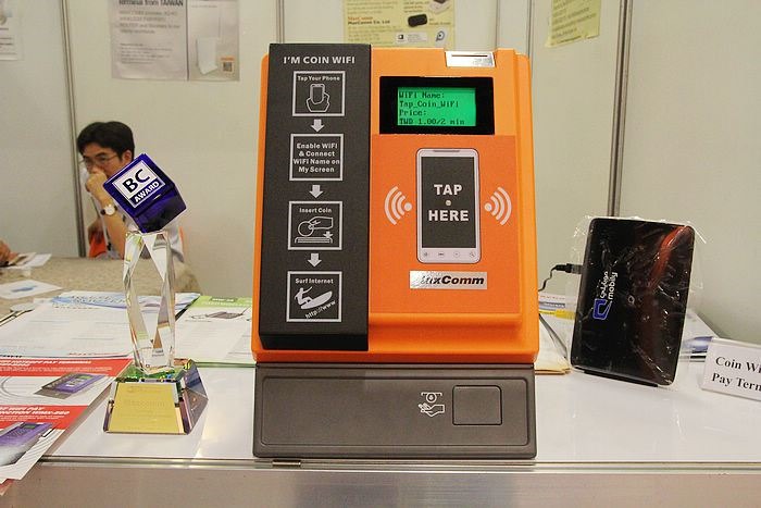 最後啊!還要介紹一個有趣的產品,大家有想過 WiFi 跟自動販賣機結合,會產生什麼樣的火花呢?這個有趣的概念產品今年也現身在會場上囉。這台投幣式無線上網計費器,能讓公共場所的網路能被有效管制,不讓從事不法及無意義的使用者佔用網路頻寬太久,也對出國在外沒有事先租用分享器及申請漫遊的用戶,提供了更經濟且安全的選擇。