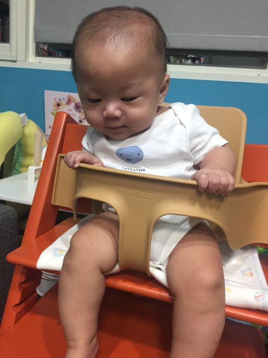 雖然看來他還蠻喜歡這張椅子,但可能由於才 5 個月大還坐不太穩,所以必須抓著護欄來保持平衡。