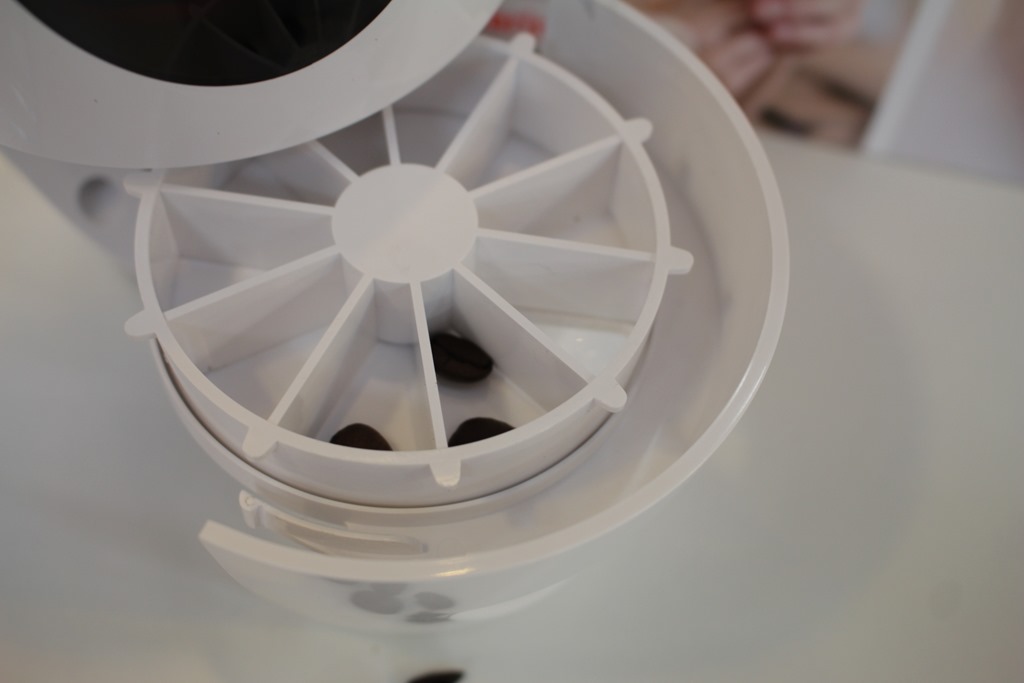 這是一款可以與寵物互動的視訊鏡頭,只要透過 Wi-Fi 網路與智慧型手機連線,利用專屬的 APP,就能遠端與你心愛的寵物互動囉!想要先讓你的寵物靠近這台互動機,一定要有飼料,輕輕拉開飼料容器,就能放置一些寵物愛吃的食物,遠端控制餵食!