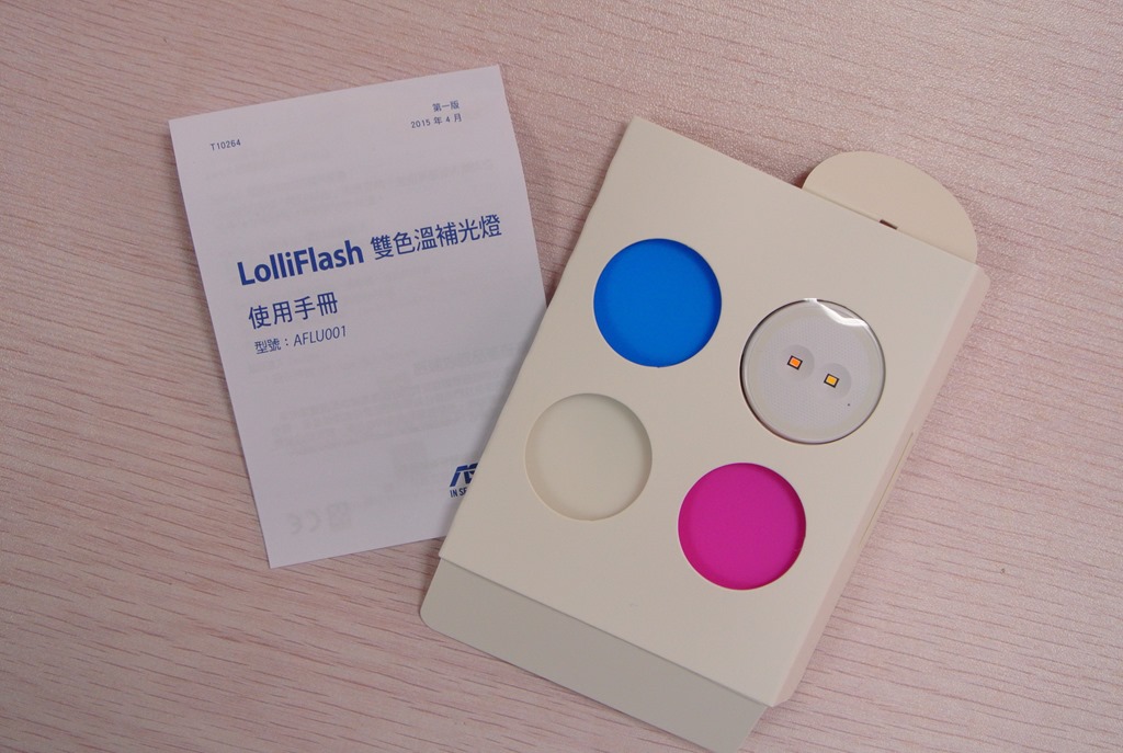 LolliFlash 是一款外接、無線的補光燈,包裝內有使用手冊,除了 Lolliflash 補光燈之外,還附有白、紅、藍三色濾鏡,讓使用者依環境做替換,輕鬆拍出滿意的照片!設計上採雙色溫的設計可以讓色彩不失真。