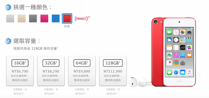 在配色上,第六代 iPod touch 也做了一些調整,將萊姆綠換成了金色,而原先的淺藍色也變為深藍!另外一項最大的改變,就是容量選擇不再只有過去的 32 GB 及 64 GB 而已,由於容量的延伸,讓 iPod touch 容量選擇從最小的 16 GB 起跳,而最大容量也從原先的 64 GB 延伸至少見的 128 GB!這也讓喜歡大量下載音樂、影片、遊戲及拍照的朋友有更多的容量可以應用!