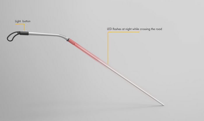 這支盲人專用智慧拐杖設有 LED 燈,提升視障人士夜間行走在馬路上的安全性,
