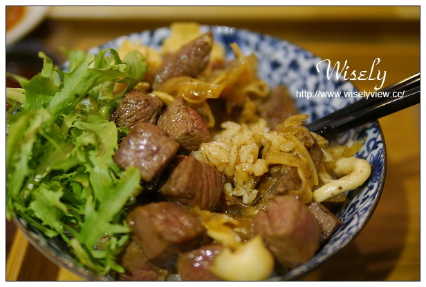 當家No.1的『骰子牛菲力』的確是比較好吃,跟當晚去吃串燒的骰子牛串相比較,它的口感比較軟嫩而且有蒜片搭配也挺不錯的;裡頭的醬汁有點像是壽喜燒的那種洋蔥調味偏鹹甜的味道,再加上青菜與半熟溫泉蛋,是滿不錯的組合。