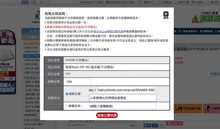 為什麼說他麻煩?因為他會要求你寫下出價的理由(挑戰原因欄位),這裏可以選擇兩個原因,一是通路比價、另一個則是團購需求。不過我猜一般人都不會選團購需求(當然你真的要買很多支也是可以填啦),因此我們就直接用「通路比價」來處理比較快。我找到的是 PChome 購物(不是 24 小時!),填上的原因則是「人家賣得比你們網站還便宜」(這是真的!)。