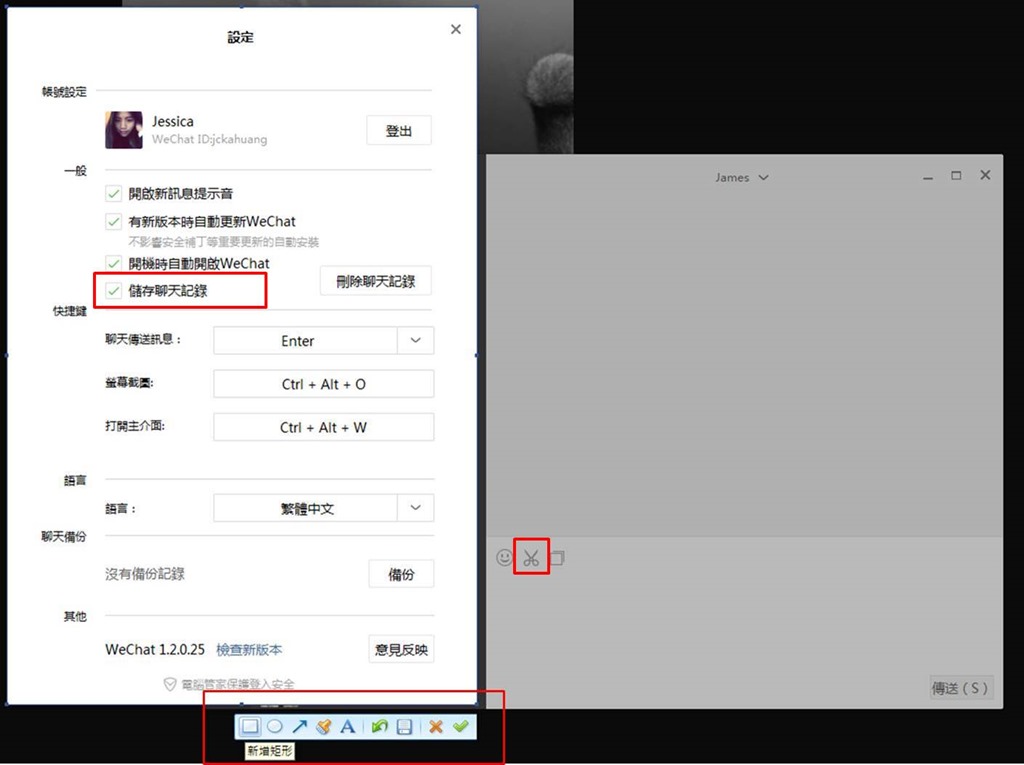 ◆於WeChat電腦版任一聊天室或對話中點擊「剪刀的圖示 」