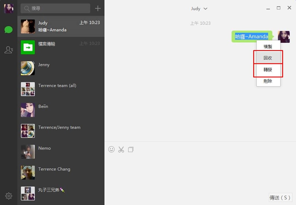 WeChat獨家「訊息回收」功能,也能於電腦版同步使用囉!在任何一個WeChat聊天室或對話中,任一訊息都能在發出訊息的兩分鐘之內「回收」,提供使用者回收包括文字訊息、圖片、動態貼圖、影片、6秒微影片以及名片等,讓錯誤的訊息馬上回收!此外,電腦版也可以與朋友分享檔案、轉發訊息或微影片(除語音訊息不得轉發,其他皆可),而用戶在電腦版上的互動也只會儲存於裝置內,即使登出了電腦版,WeChat用戶仍可在手機上閱讀完整對話。