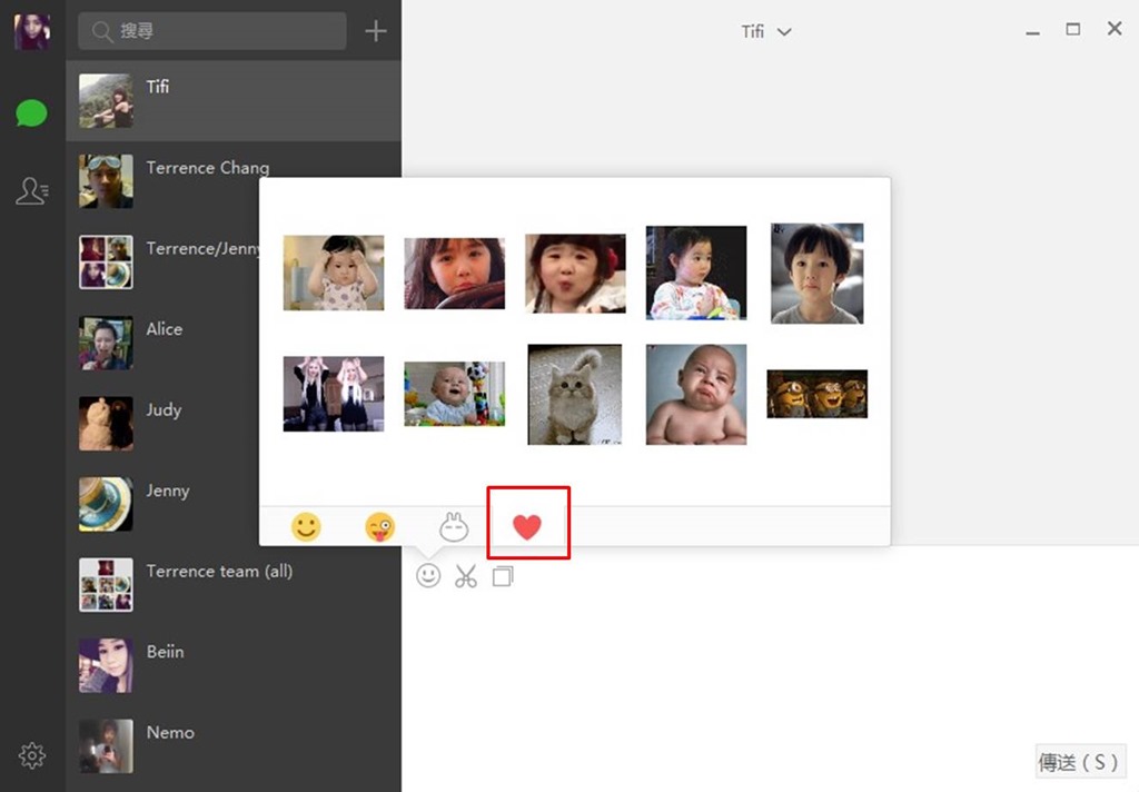 WeChat 電腦版現在也提供聊天歷史紀錄功能囉!於電腦版左下角的「設定」中勾選「儲存聊天紀錄」後,再次登入時,即可閱覽之前電腦版上的聊天紀錄。電腦版可發送自定義貼圖,於WeChat手機版任一聊天室中按下「 表情符號」鍵後,按下「 愛心」鍵後進入「自定義貼圖」。「自定義貼圖」可於手機版新增任何動態或靜態圖片(檔案需小於10K)成為貼圖後,即可於電腦版同步使用。