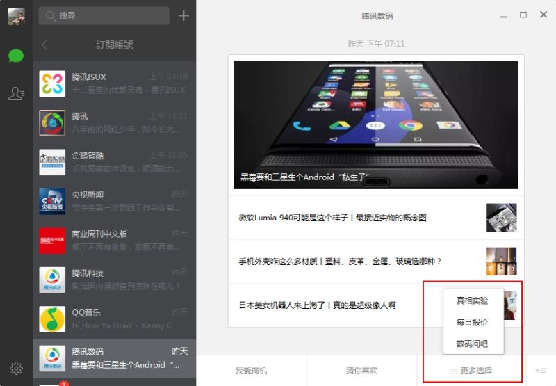 關注的WeChat官方帳號可同步於電腦版瀏覽,點擊官方帳號即可觀看文章及點擊選單。
